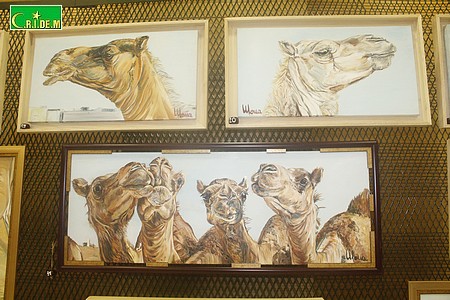 Enfin portrait de chameaux dont les têtes perchées dans l’azur nous narguent de leur hauteur. Leur regard et leur expression finement sculptés par des jeux d’ombre et de lumière s’animent sous la précision des touches du pinceau. Ils sont reconstitués en un troupeau imaginaire dans un puzzle géant.