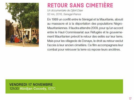 Sélectionné pour "Le Prix des Lagunes du Meilleur Documentaire", Retour sans cimetière est en compétition avec quatre autres documentaires venus du Tchad, du Sénégal, du Niger et de la Côte d’Ivoire, pays organisateur du Festilag qui récompense des films africains.