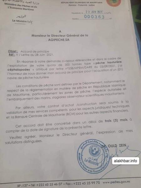 Dans ce contexte d’accusations de clientélisme, Alakhbar a obtenu la copie d’une lettre dans laquelle le ministre Dy Ould Zein donne son accord de principe à la société AGIPECHE.SA pour l'octroi d'une licence de 300 tonnes de poissons (Pêche hauturière céphalopodes).