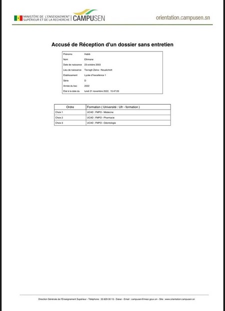 Ceci est attesté par le document d'orientation ci-joint émis par la Direction d’orientation et qui confirme l’orientation de Habib pour étudier la médecine au Sénégal.