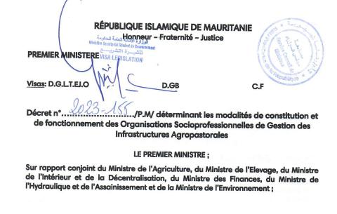 Les décrets objet des ateliers régionaux précités, préparés et adoptés par le Gouvernement au mois de mars 2023 en appui aux ministères chargés de l’Agriculture, de l’Elevage et de l’Hydraulique, eu égard à leur qualité d’acquis indispensables en vue d’assurer la pérennité de la gestion des investissements réalisés, précisent de manière qui ne laisse aucun équivoque, les modalités de constitution des OSP (Organisations Socio-Professionnelles) au niveau territorial le plus bas d’une part et celles de la contractualisation entre l’Etat et lesdites organisations, d’autre part.